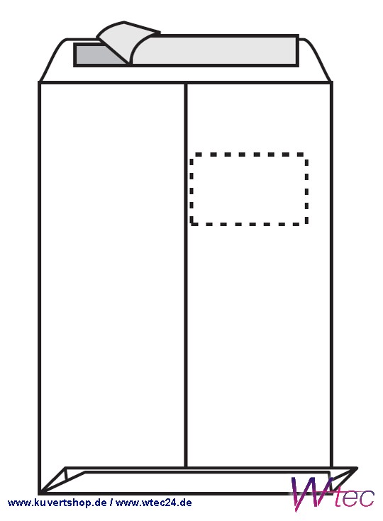 Verschluss: Haftklebung ( Abdeckstreifen), Lasche an der schmalen Seite, Klappe umgelegt